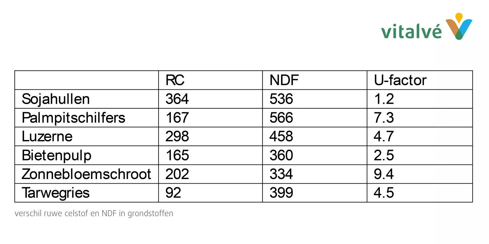 Met deze inzichten kunnen we rantsoenen nóg scherper samenstellen. We zien bijvoorbeeld dat grondstoffen die op papier vergelijkbaar lijken in ruwe celstof, in werkelijkheid een heel andere vertering hebben in de pens. De U-factor laat dit in één oogopslag zien. (zie onderstaande tabel) Zo blijkt uit onze analyses dat palmpitschilfers en bietenpulp nagenoeg gelijk zijn in ruwe celstof, maar in de pens totaal anders verteren. Aan de andere kant liggen luzerne en tarwegries qua ruwe celstof ver uit elkaar, maar is hun verteerbaarheid in de pens juist opvallend vergelijkbaar. Dit toont het belang aan van het begrijpen van hoe celwanden écht worden afgebroken in de pens van de geit.